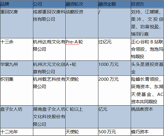 这笔投融资中的三大主角分别是:B站、泡泡玛特、汉服,堪称当下“年轻人的三件套”。相比二次元和盲盒,汉服圈如今还没能产生代表性上市公司,放眼全网超千家店铺,获资本青眼只有重回汉唐、十三余、华裳九州和织羽集等少数几个品牌,即便加上有汉服元素的国风摄影品牌“盘子女人坊”和次元少女馆“十二光年”,出挑的公司也不超过十家,且其整体融资规模、轮次也都集中在早期阶段。