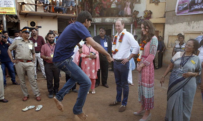 此前,王子夫妇在贫困地区见到了一些贫穷的孩子们。这一地区的旁边就是富人区。在众人面前,王子和王妃都表演了踢足球。这里位于孟买的马拉巴尔山地区,居住着一万多人。在一个小的广场上,未来的国王和王后与贫民窟的居民的交谈。这里的居民们说,自己国家的政客和名人们从来没有到过这里。威廉王子还鼓励一位刚刚毕业的男孩在未来可以成为宝莱坞的一名舞者。他和凯特都跟孩子们一起参加了足球射门练习,不过他和妻子都没能在7码的距离射中目标。