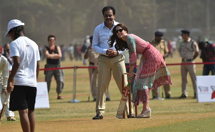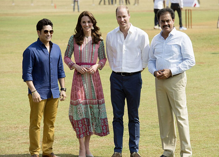 与此同时,凯特王妃也身穿清凉的夏装在几千名印度儿童的注视下体验了板球运动。在打出一个好球之后,她开心的庆祝起来。之后,前印度板球队的队长Sachin Tendulkar到场,这位传奇板球运动员在谈到凯特王妃时说道:“她可以击球,她可以登场比赛,她无所不能。”