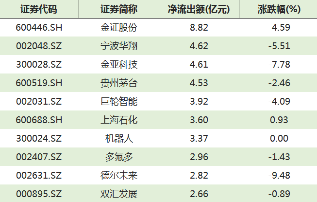 金证股份(600446.SH)、宁波华翔(002048.SZ)、金亚科技(300028.SZ)净流出额居两市个股前列,分别为8.82亿元、4.62亿元、4.61亿元。其中,金证股份也因其6.06亿元的主力净流出额成为当日最不受主力欢迎的个股。