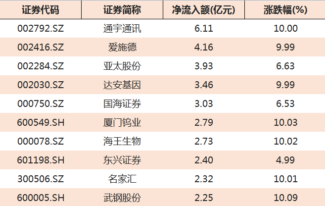 通宇通讯(002792.SZ)、爱施德(002416.SZ)、亚太股份(002284.SZ)领衔4月11日十大资金净流入个股,其净流入额分别为6.11亿元、4.16亿元、3.93亿元。其中,爱施德成为当日两市最受主力青睐的个股,其主力净流入额为3.66亿元。