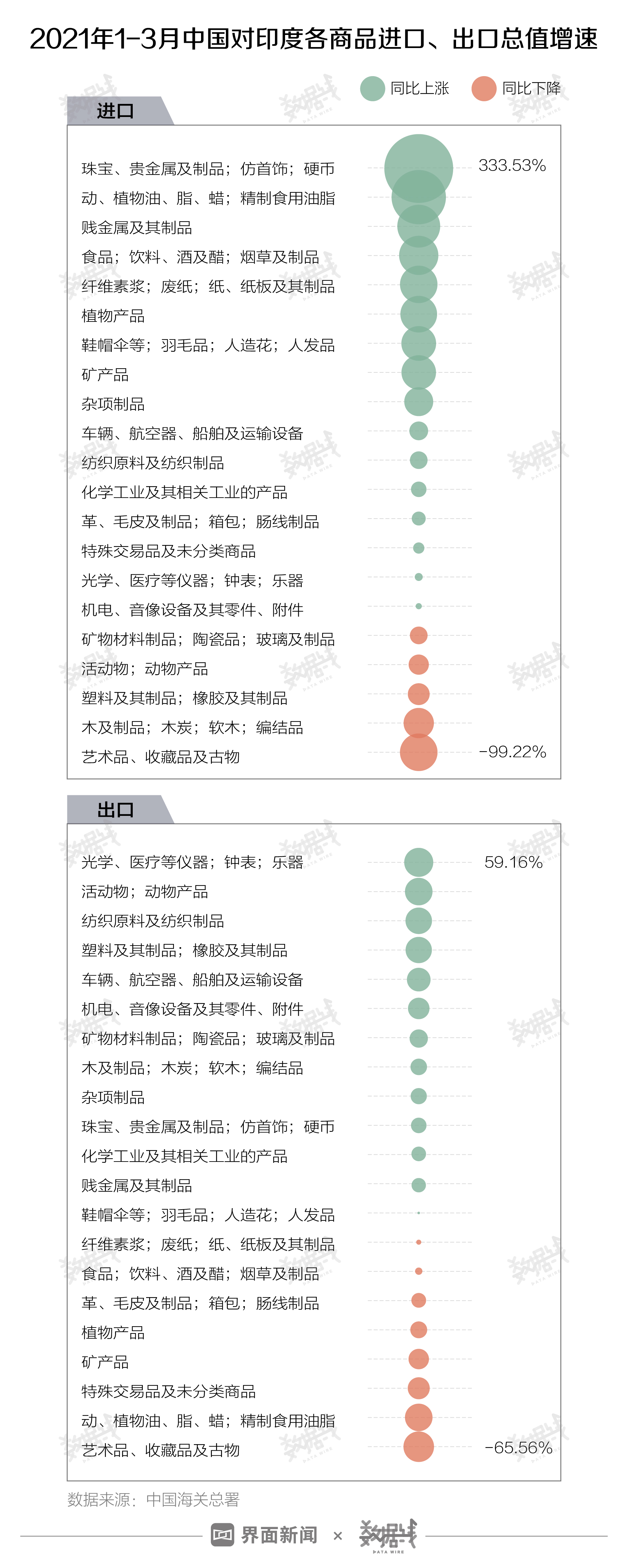 从进出口数据来看,印度此轮疫情爆发前的3个月,中国对印度进出口商品总值为1799.5624亿元,较2020年同期上涨33%。其中,对珠宝、贵金属及制品、仿首饰及硬币类进口总值涨超330%,对动、植物油、脂、蜡、精制食用油脂类进口总值涨超200%。