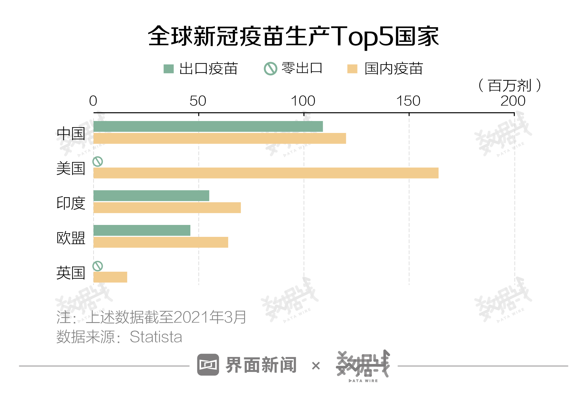 在新冠疫苗供应上,中国疫苗或迎出口新局面。据新华社报道,印度正由全球疫苗接种施援方被迫转为受援方,形成对全球疫苗资源的挤兑。据Statista此前数据统计,截至3月印度疫苗出口量排名全球第二,达0.55亿剂,仅次于中国。