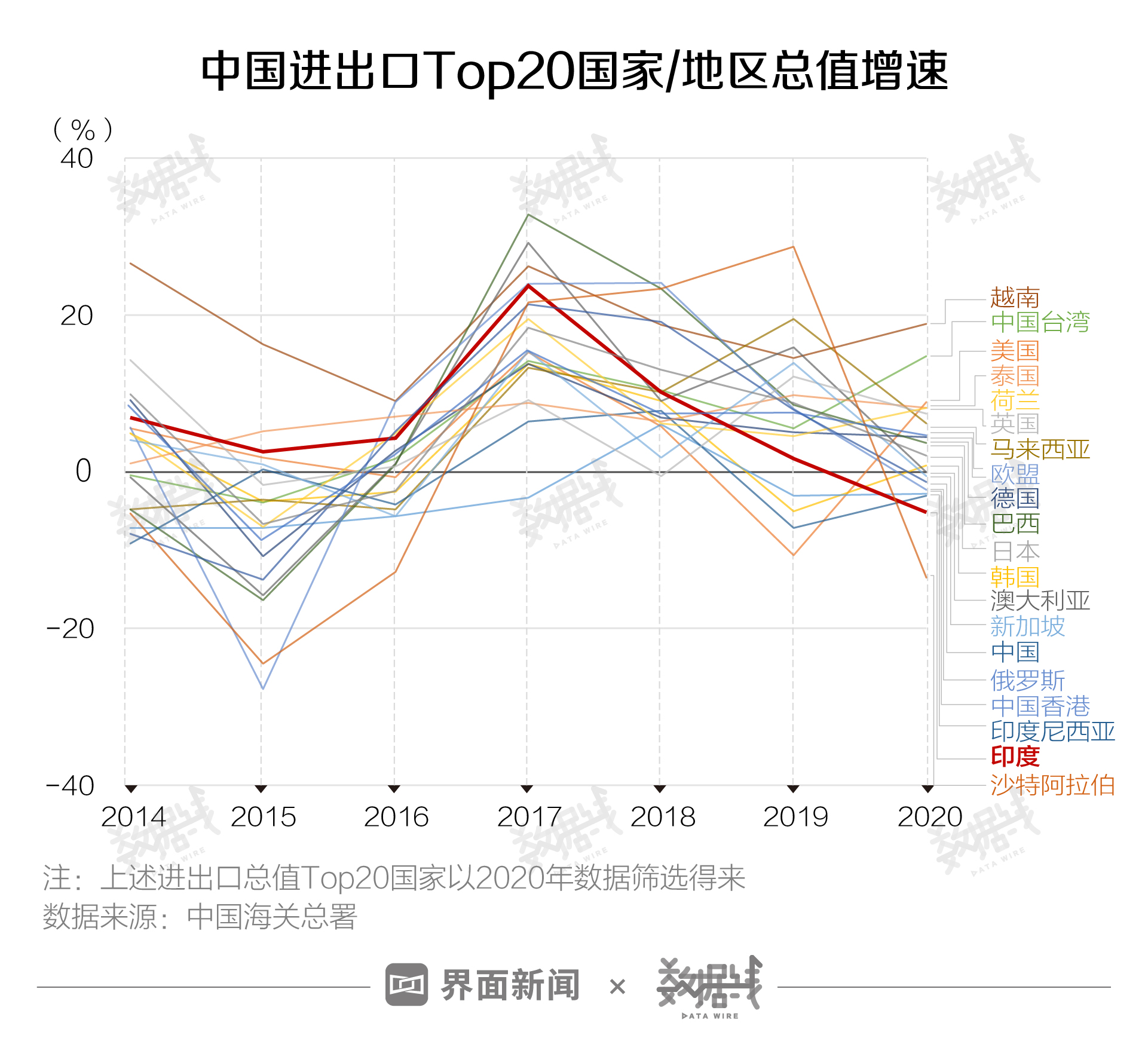 从增势上来看,2017年以来中国对印度进出口总值增长逐年趋缓。截至2020年,中国对印度进出口总值同比下降5.3%,较2017年增速减少了约28.9个百分点。
