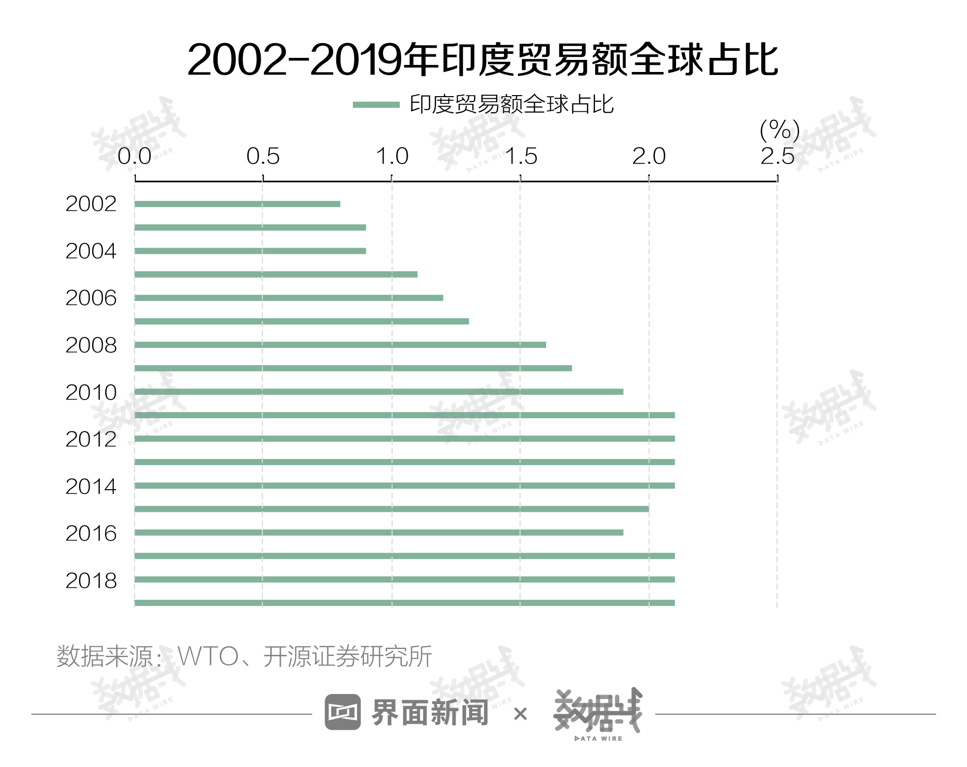 全球范围内,持续恶化的印度新冠肺炎疫情对经济冲击相对有限。据世界贸易组织(WTO)数据,截至2019年,印度贸易额全球占比仅为2.1%,远低于中国、欧盟、美国等。