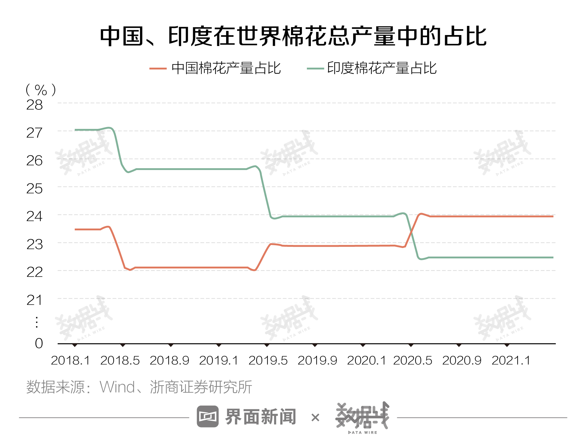 从上游原材料端来看,印度疫情带来的全球棉花缺口或提振中国棉花出口。据Wind数据,自2020年5月起,中国棉花产量世界占比就已超过印度。