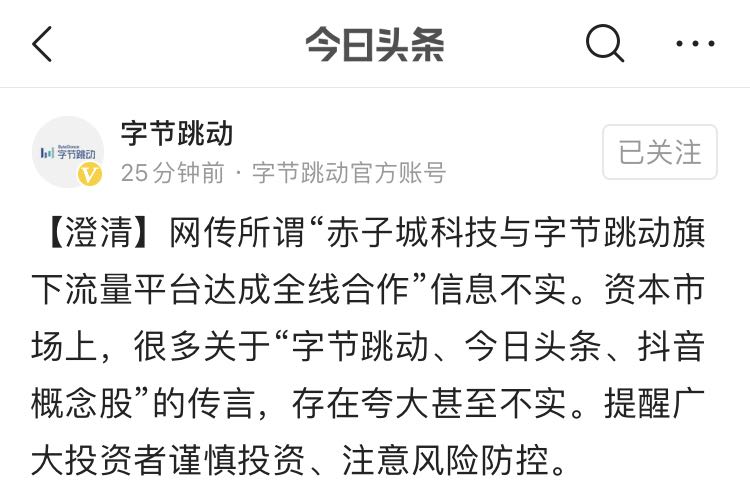 5月7日,字节跳动在其官方头条号发布消息称,网传所谓“赤子城科技与字节跳动旗下流量平台达成全线合作”信息不实。资本市场上,很多关于“字节跳动、今日头条、抖音概念股”的传言,存在夸大甚至不实。提醒广大投资者谨慎投资、注意风险防控。