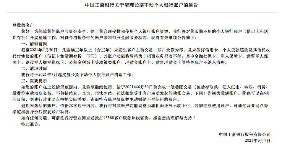 工商银行7日通过官网发布清理长期不动个人银行账户的通告。清理范围为,截至2021年6月30日,凡连续三年以上(含三年)未发生客户主动交易,账户余额为零,且未签订信用卡、个人贷款还款及其他代收代付协议的账户(借记卡和活期存折,下同),其账户功能将调整为非柜面业务只收不付。其中金融社保卡、军人保障卡、武警军人保障卡、退役军人拥军优抚卡、公积金联名卡等政策类账户;理财金账户卡、财富理财金卡等特色账户不纳入清理。