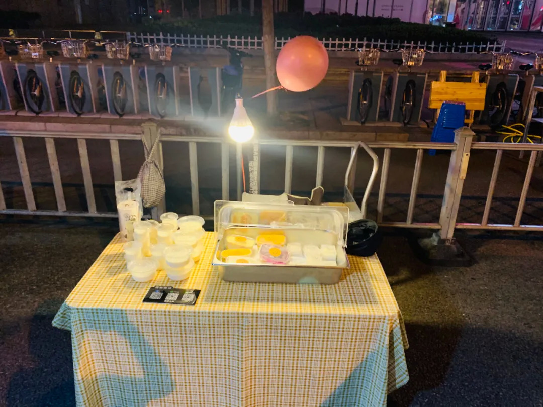 霜霜:那你在从事甜品行业,比如说做甜品铺子之后,你的生活有什么不一样吗?其实摆摊也会遇到不一样的人,有什么不同的经验吗?小禾:摆摊还是挺有意思的。不过它对我生活的影响是,首先作息变得非常阴间。摆摊的时候,我们会吆喝今天卖什么。我们一般晚上都做千层盒子、雪媚娘、双皮奶,我就喊:“现做甜品看一下,千层雪媚娘双皮奶都是刚做的,动物奶油新鲜水果用做,快看一下吧。”每天晚上在喊,主要是要给别人形成一个印象,我们和卖炒面、卖臭豆腐、卖凉粉的不一样。