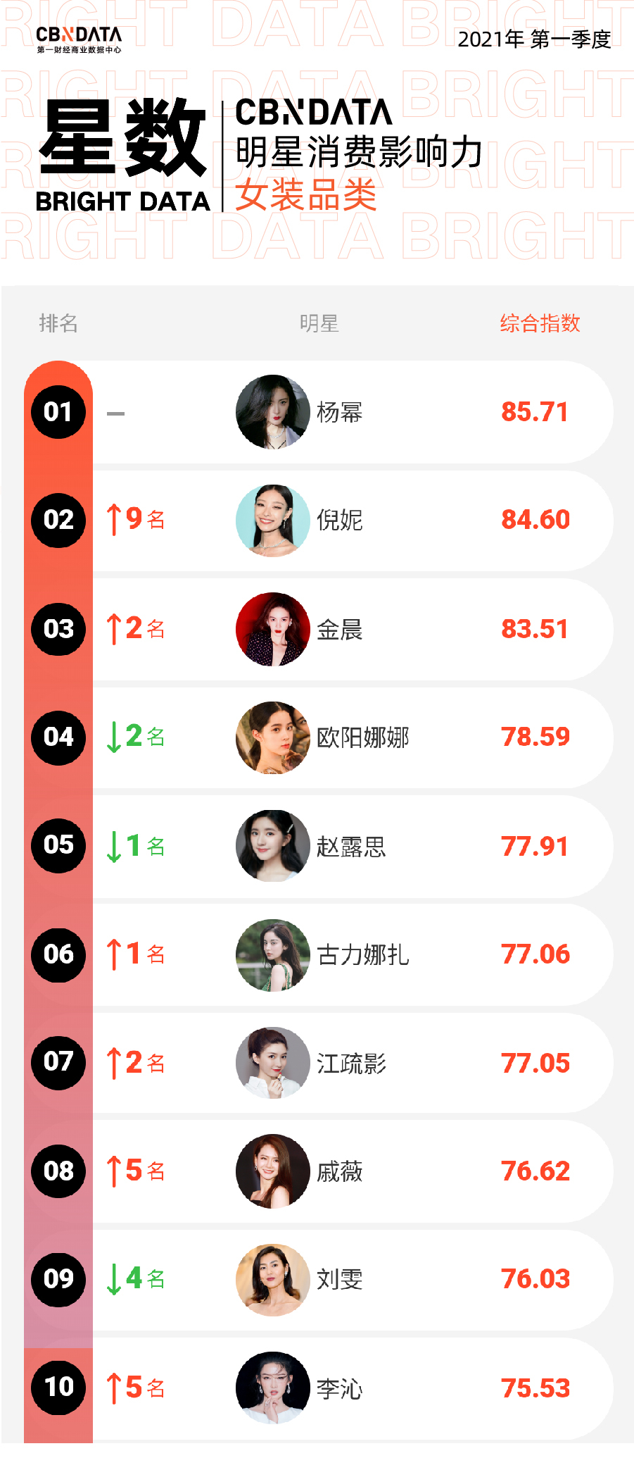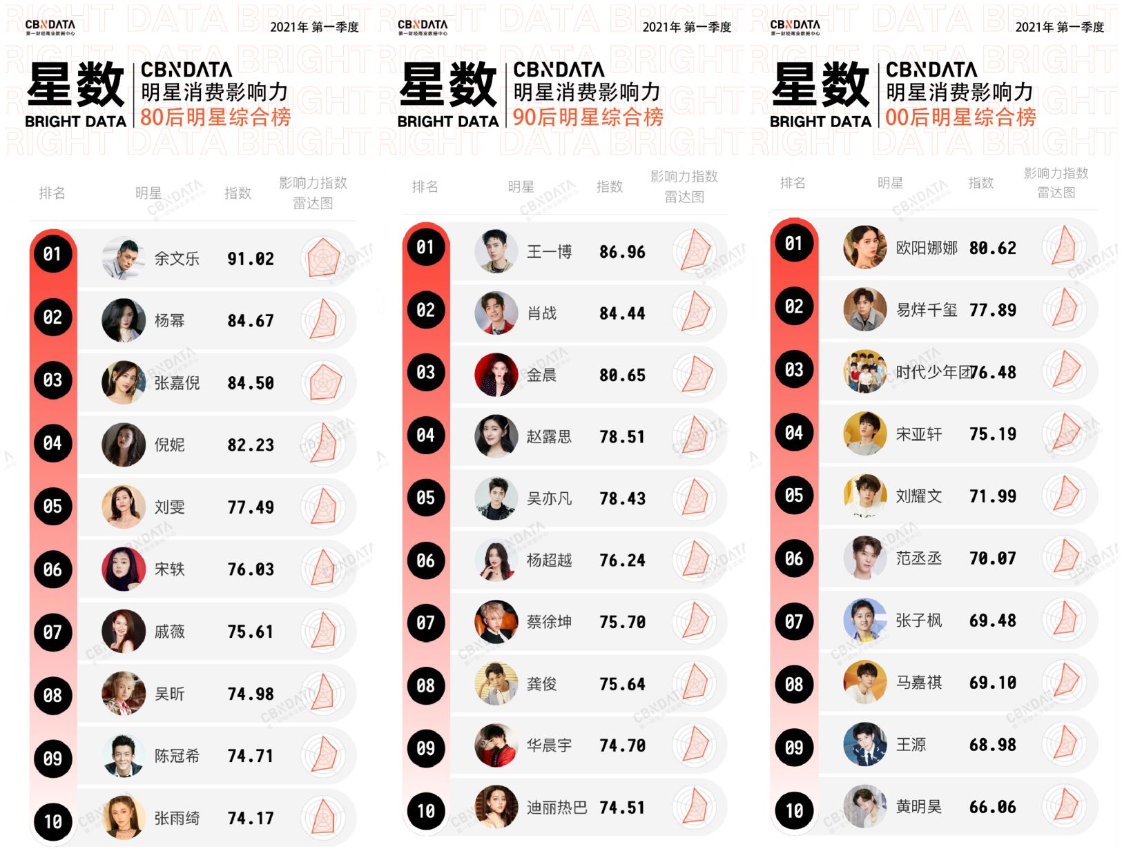 5月7日,第一财经商业数据中心(CBNData)星数发布了2021一季度“CBNData星数明星消费影响力榜”,本期榜单基于阿里巴巴消费大数据,以2021年第一季度为测算周期,发布了1个季度总榜、2个性别榜、4个代际榜、7个品类榜及20个城市榜,通过综合“明星消费辐射力、明星消费转化率、明星带货直达力、影响人群购买力、明星商品聚焦度”五大明星消费影响力指数,综合衡量明星消费价值。