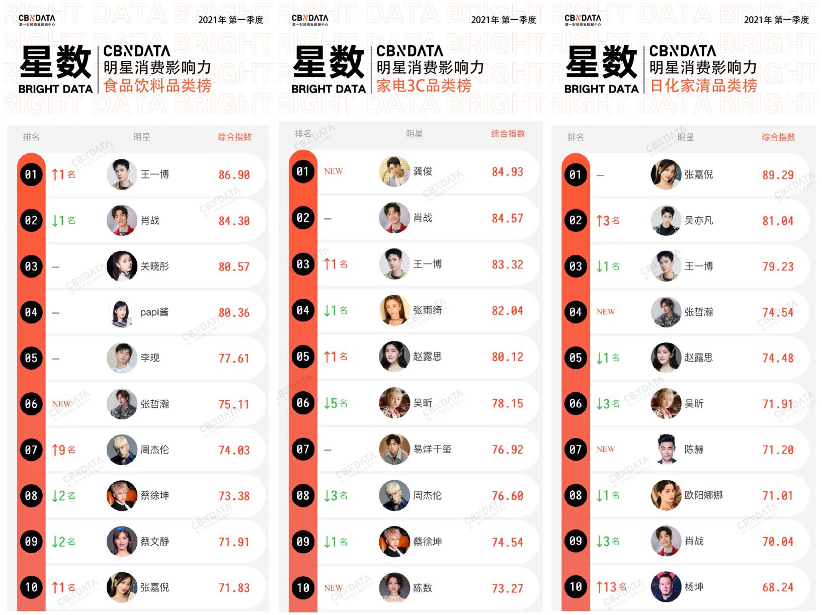 俨然成为新流量的两人也展现出与热度相匹配的带货实力。根据星数2021一季度消费影响力数据,龚俊和张哲瀚的消费影响力指数和排名都有了质的飞越。除了总榜外,在家电3C品类,龚俊甚至超越肖战和王一博,凭借同款手机配饰的爆款带货,首度跻身该品类TOP1。
