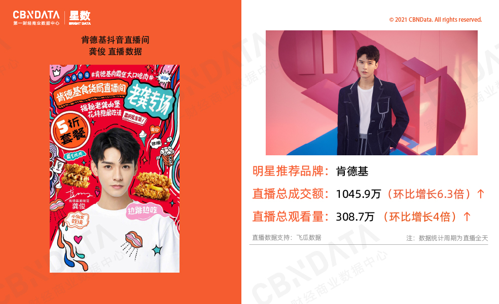 一个更为明显的上升势头是两人走进直播间带货时的亮眼战绩。龚俊进入薇娅直播间为自己代言的品牌Tangle Teezer带货,该款商品销售额超1500万;一叶子邀请新宣代言人张哲瀚进入品牌直播间,最终带货销售额高超1400万,更新了今年淘宝平台品牌直播间的带货最高成绩。此外两人代言的红门雅顿、舒适达、肯德基等品牌也同样吃到了新流量的红利,带货效果非常可观。