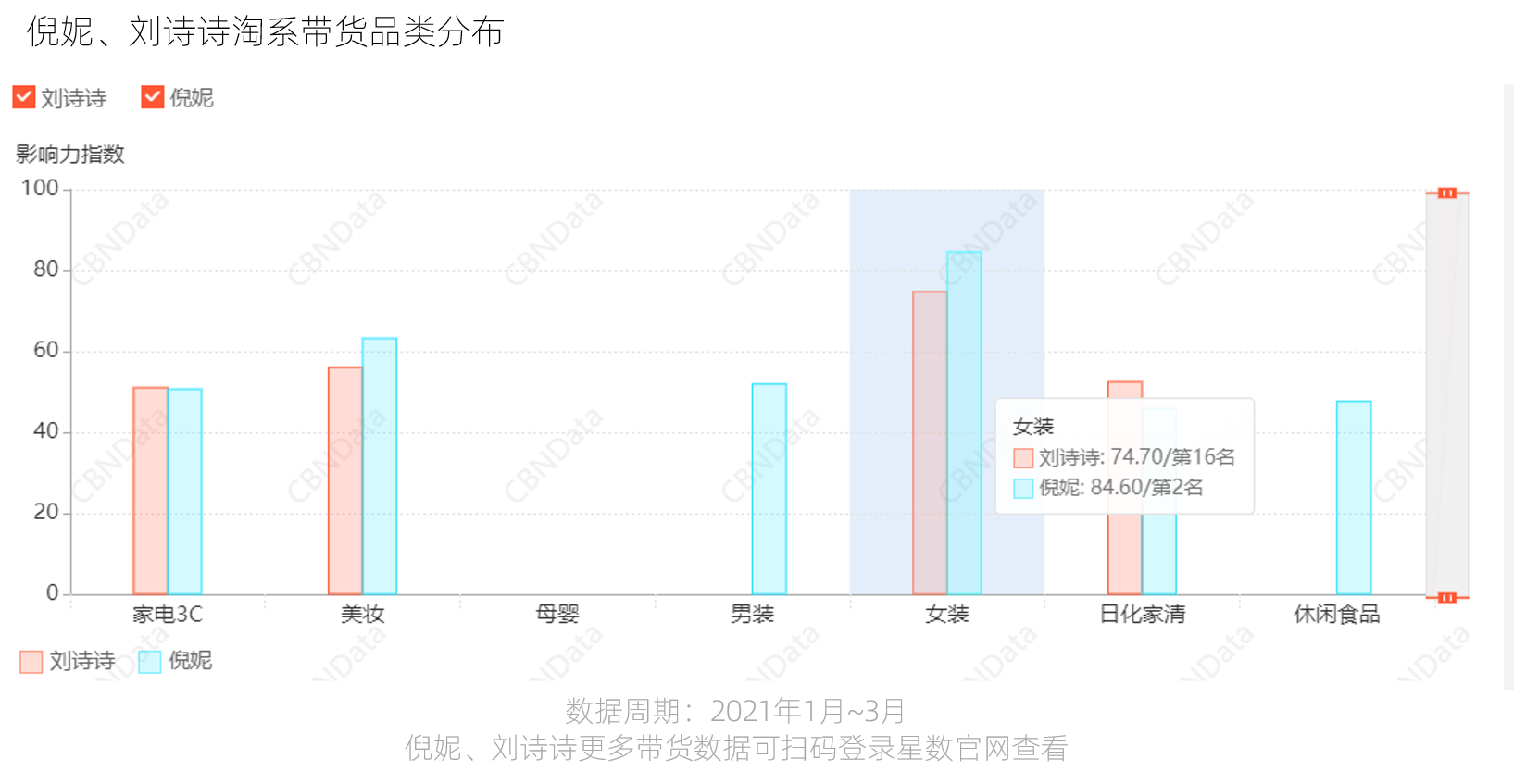 80后明星榜单较上季度总体变化不大,保持着非常稳定的带货态势。其中排名上升进步较大的倪妮,是因为其在2020年底上线的《流金岁月》,剧中同款服饰引发大批观众种草。去年秀综《乘风破浪的姐姐》而火的张雨绮、金晨,因为良好的后续商务资源,也保持着名列前茅的带货成绩。