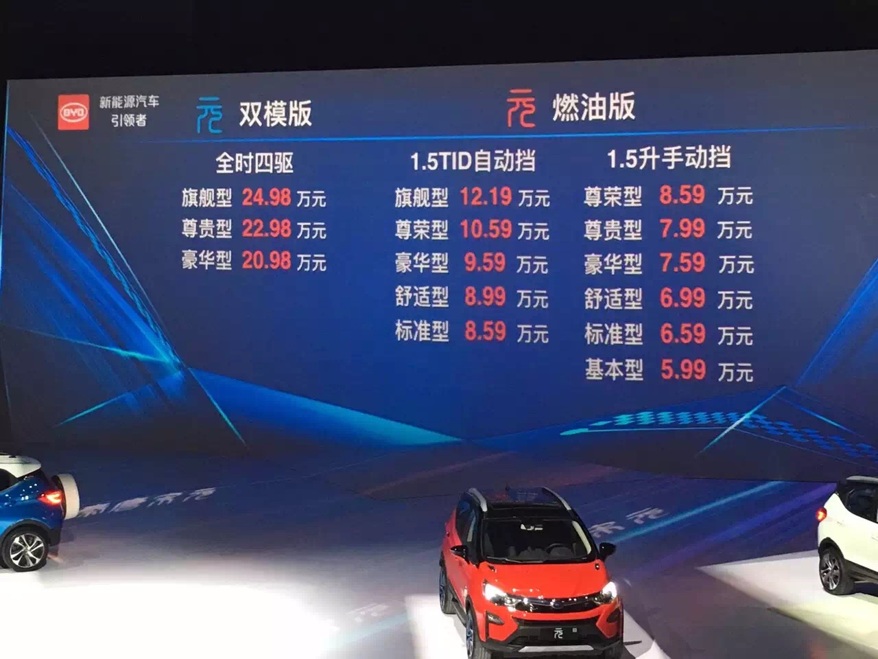 今晚,比亚迪旗下首款小型SUV比亚迪元在北京正式上市。共推出1.5L、 1.5T以及插电式混合动力版共三款动力配备的车型,燃油版售价为5.99万-12.19万元,插电式混动版售价为20.98万-24.98万元。