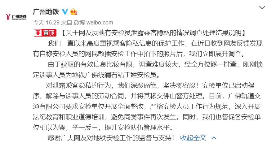 5月7日,@广州地铁 微博发布《关于网友反映有安检员泄露乘客隐私的情况调查处理结果说明》。