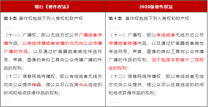 这些问题在新《著作权法》中得到了一定解决。第十条的广播权加上了“有线或者无线方式”的表述,将涉及范围扩展到了直播等互联网形式。此外,新增第五十一条中明确指出“知道或者应当知道作品、版式设计、表演、录音录像制品或者广播、电视上的权利管理信息未经许可被删除或者改变,仍然向公众提供”,明确平台责任。