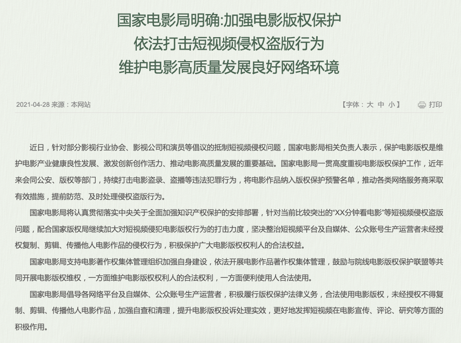 4月,长视频行业超70家影视传媒单位及500多位从业人员先后两次发布《联合声明》,呼吁短视频平台和公众账号生产运营者切实提升版权保护意识,停止对影视作品内容的侵权行为。中宣部版权管理局和国家电影局随后宣布打击短视频侵权行为。