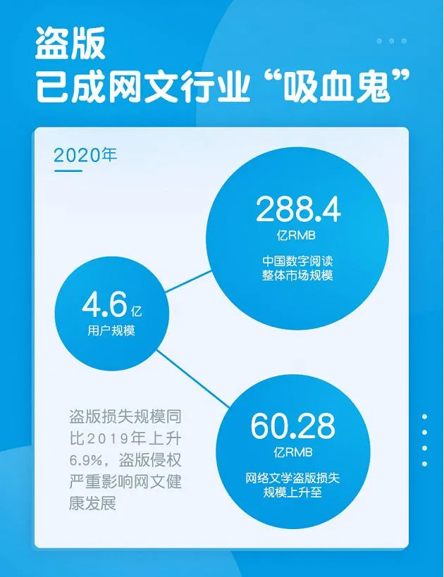 但长期存在的网文盗版问题如影随形。白皮书显示,2020年中国网络文学盗版损失规模达60.28亿元,同比2019年上升6.9%,新技术滥用、传播途径杂多和盗版在全产业链实现覆盖是规模上升的主要因素。