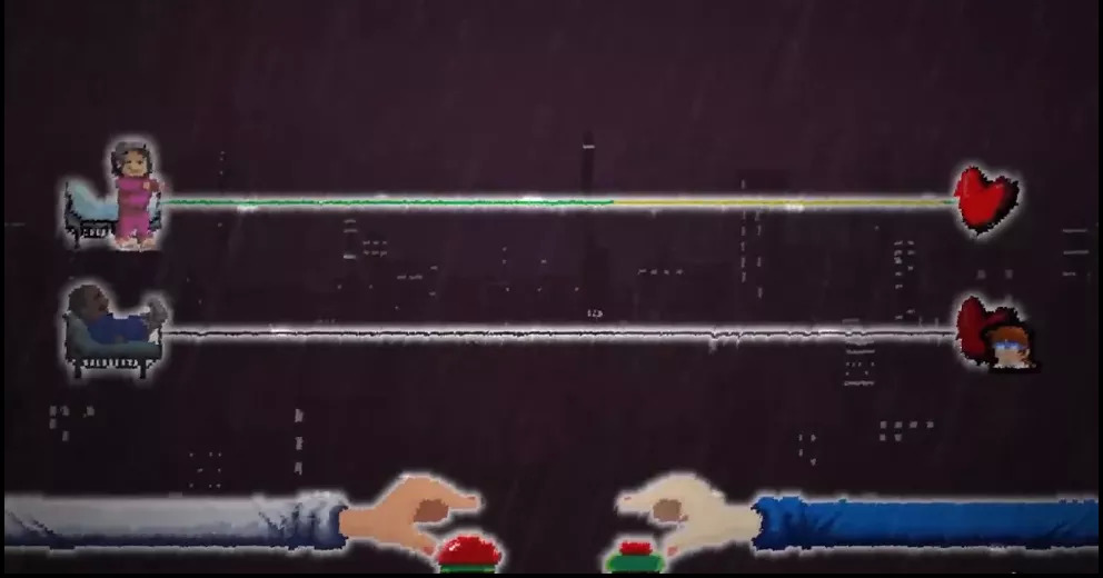 在没有歌词的游戏3-3“分离二重唱”关卡里,出现了一对年迈的夫妻,他们都住在这个医院,但并没有在同一个病房。丈夫腿脚受伤躺在了床上,医生正在为他治疗,而玩家则在为妻子治疗。