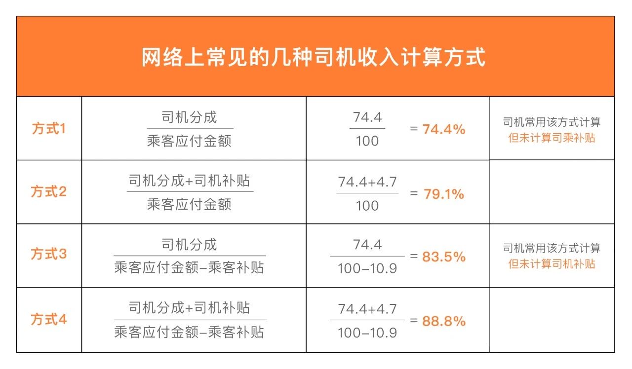 如上图所示,滴滴解释道,网络上出现过多种计算司机收入占比的方式,近期个别司机反馈及媒体报道“抽成高”,普遍是按照方式1或方式3计算。