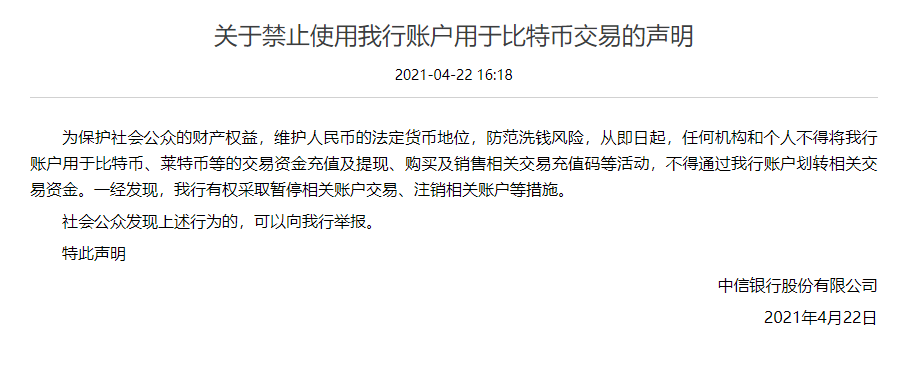 中信银行近日在官网发布公告称,任何机构和个人不得将中信银行账户用于比特币、莱特币等的交易资金充值及提现、购买及销售相关交易充值码等活动,不得通过中信银行账户划转相关交易资金。一经发现,中信银行有权采取暂停相关账户交易、注销相关账户等措施。