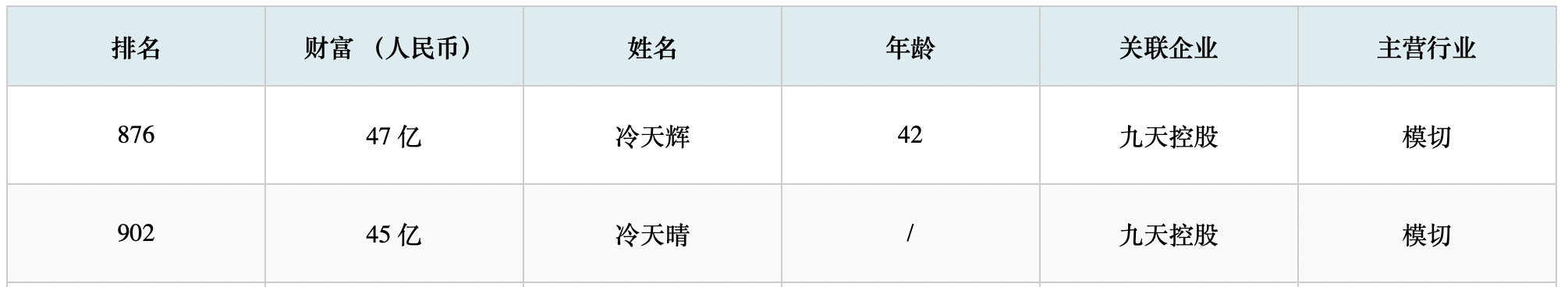 在胡润百富官网,目前显示有2020年和2019年的百富榜榜单,均无冷天辉在榜。新浪收录的2018年胡润百富榜榜单显示,九天控股的冷天辉以及冷天晴分别以47亿元和45亿元财富在列。多年以来,根据胡润百富的数据,不乏有关云南富豪的文章,将冷天辉列入云南十大富豪。