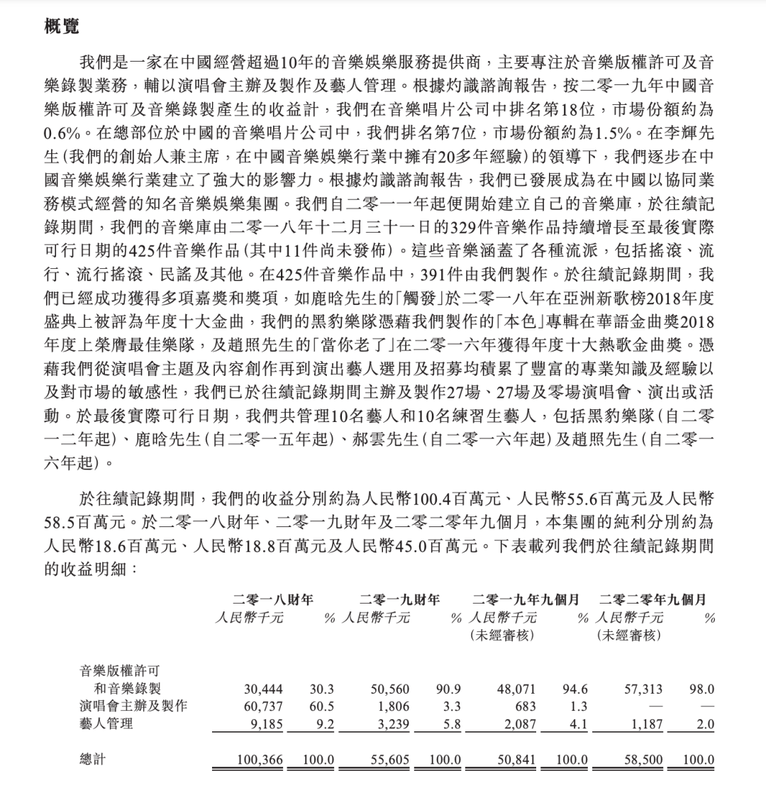 根据其招股书显示,这是一家专注音乐娱乐服务的提供商,于2010年创办的“怒放”摇滚音乐节使这家公司得以出名。“怒放”音乐节由北京及上海举办的两场原创演唱会组成,共吸引超过45000名观众,获得包括黑豹乐队、崔健、张楚、何勇、汪峰、许巍、郑钧、朴树、罗大佑等不同年代的摇滚艺人倾情演出。