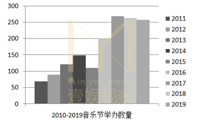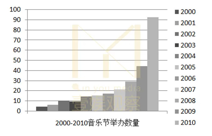本世纪头十年,国内音乐节无论是数量还是规模,均不断突破新高,音乐节数量从最初4场达到2010年的92场,其中2009-2010年度增幅高达109%:
