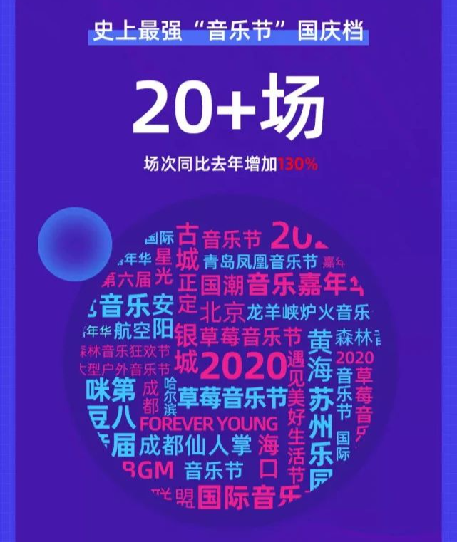 当然,音乐节扎堆小长假的“内卷化”在去年已经有了迹象。早在2020年国庆档期间,受疫情影响沉寂已久的线下演出市场就迎来了第一轮爆发。据大麦网《2020演出国庆档观察》报告显示,国庆节八天假期,音乐节高达二十余场,比去年同期上涨130%,居各类演出上升率第一。