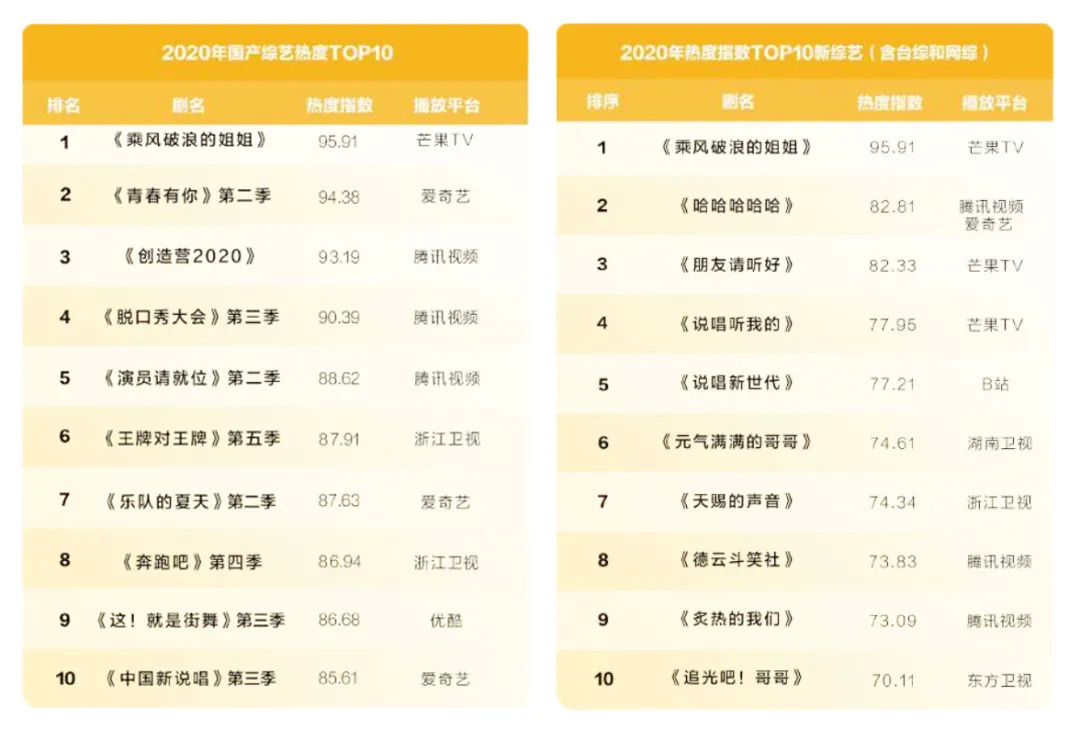 据《2020腾讯娱乐白皮书》,2020年综艺热度TOP10中,音乐综艺占据一半的数量。2020年新综艺热度TOP10中,音乐综艺的数量达到6个,诸如《中国新说唱》《乐队的夏天》《明日之子》《炙热的我们》等综艺节目,对推动乐队、嘻哈音乐出圈具有十分重要的帮助。报告分析,从行业整体来看,音乐综艺仍是行业最热的内容品类。