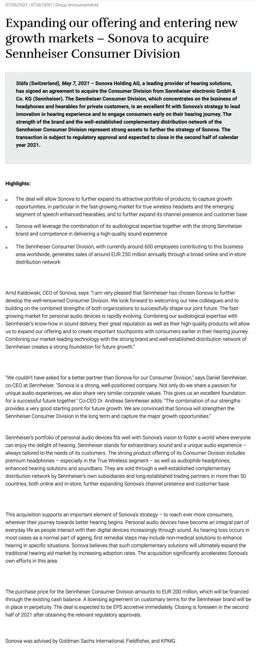 他认为,将Sonova市场领先的技术和强大品牌与森海塞尔完善的分销网络相结合,能够为未来的增长奠定坚实的基础。