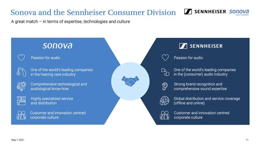 若收购完成,森海塞尔将把自己的优势和资源集中在Pro Audio(专业音响)、商务通信和Neumann(诺依曼,工作室级音频解决方案)业务领域,并将陆续扩大其业务部门;Sonova将在其听力保健产品组合中增加耳机和条形音箱,包括助听器、人工耳蜗以及其他听力解决方案,利用双方的互补能力进一步扩展业务领域。