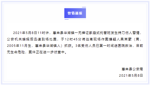 揭阳发布微信公众号消息,惠来县公安局通报称,5月8日11时许,惠来县华湖镇一无牌证家庭式托管班发生持刀伤人警情,公安机关接报后迅速到场处置,于12时45分将逃离现场作案嫌疑人吴某豪(男,2005年11月生,惠来县华湖镇人)抓获。3名受伤人员已第一时间送医院救治,目前无生命危险,案件正在进一步侦查中。