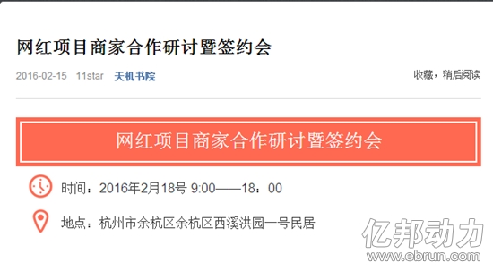 一、天机曾举办网红招商会。亿邦动力网注意到,天机个人公众号“天机书院”在2月15日发布了一篇题为“网红项目商家合作研讨暨签约会”的文章,该签约会在杭州举办,时间为2月18日。