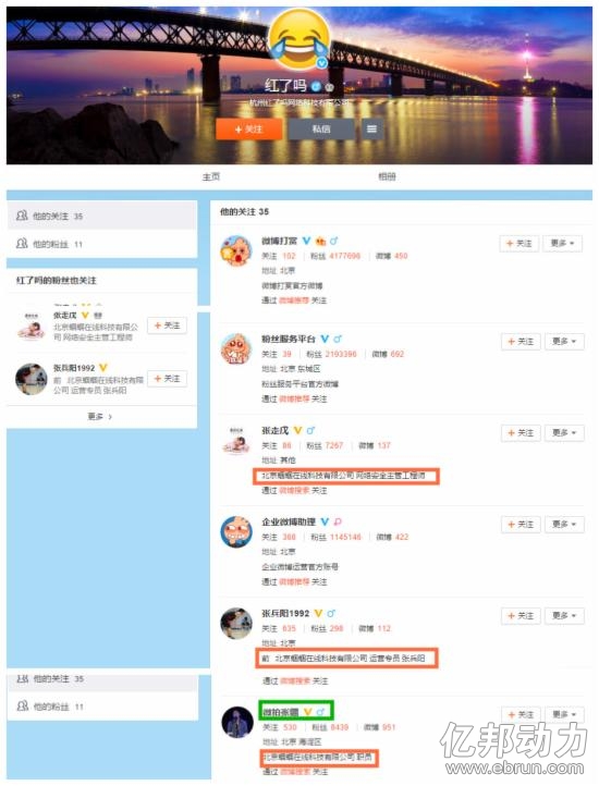 四、名字有可能叫“红了吗”。在新浪微博上,亿邦动力网发现了一个名叫“红了吗”的加V用户,其微博认证为“杭州红了吗网络科技有限公司”。该用户没有发布过任何微博,但有35个关注对象,其中通过微博搜索功能关注的只有3个加V用户,全部是蝈蝈在线的职员,包括一个微博名为“微拍张疆”的用户。