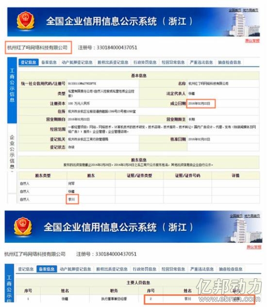 五、工商局注册信息曝光。在工商局的全国企业信息公示系统(浙江)当中搜索“红了吗”,亿邦动力网真的发现了一家名叫“杭州红了吗网络科技有限公司”的企业。它正式成立于2016年2月22日,注册资金100万人民币,经营业务涉及互联网、广告、企业管理,法人代表为张疆,股东有何琴、张疆和李川。其中,张疆担任执行董事兼总经理,李川担任监事,而“李川”正是天机的本名。