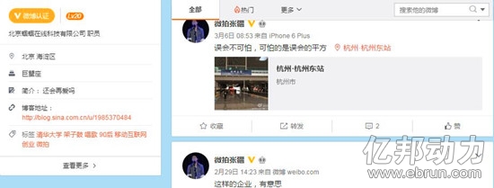 六、法人代表名叫张疆。回到微博上,亿邦动力网发现,上文提到的用户“微拍张疆”微博标签有“清华大学、90后、移动互联网、创业”等。但是,其微博内容以个人心情为主,有创业感悟,却并没有涉及“天机”、“李川”、“何琴”、“网红”、“红了吗”的相关内容。但其微博定位显示,3月6日,他曾出现在杭州。此外,根据网上公开资料,微拍是蝈蝈在线推出的手机视频社交APP,而搜索蝈蝈在线的注册信息,并没有发现张疆的身影。
