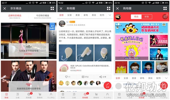 二、京东微信端已有社群雏形。亿邦动力网观察到,目前京东微信首页以特卖形式经营,而购物圈版块当中已有了社群形态,放置来自“编辑精选”的普通用户和达人发布的产品内容,最近还推出了“和鹿晗一起玩3C”、“春茶纪录片主角招募”、”京女郎票选大赛“等话题,鼓励消费者晒单,帮助产品引流。