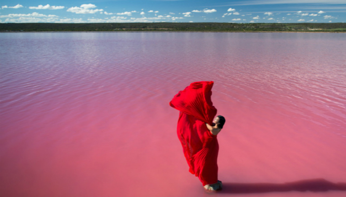 这是一位旅行博主在澳洲的粉色湖泊为法国品牌Lancome拍摄的宣传照