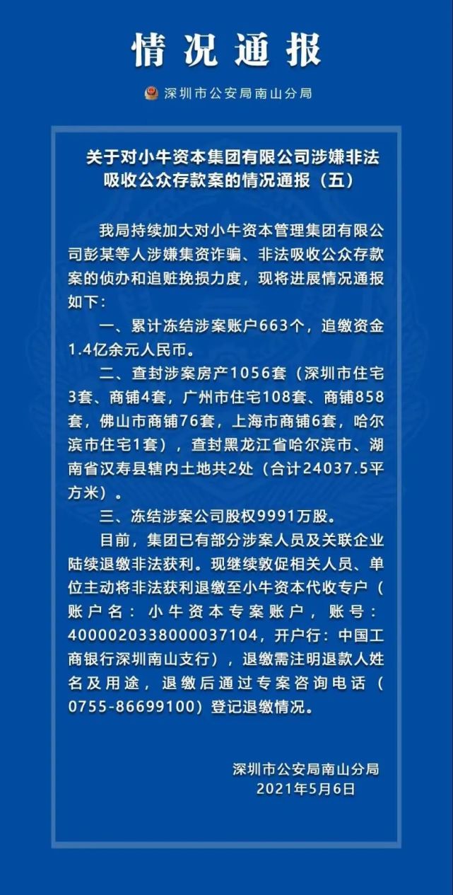 5月6日,深圳市公安局南山分局通过微信公众号“深圳南山公安”发文,对小牛资本管理集团有限公司彭某等人涉嫌集资诈骗、非法吸收公众存款案进行了进一步通报,案情进展包括已追缴资金1.4亿余元、查封房产1056套、冻结涉案公司股权9991万股。