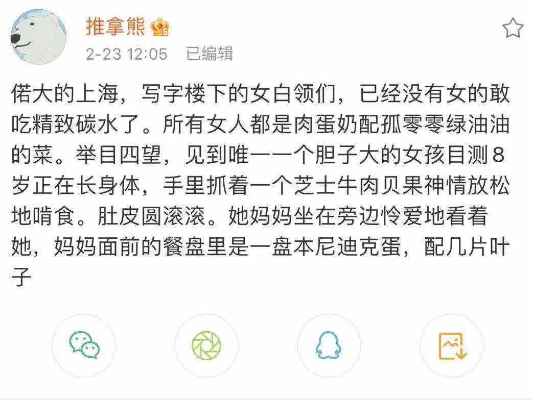 「偌大的上海,写字楼下的女白领们,已经没有女的敢吃精致碳水了。所有女人都是肉蛋奶配孤零零绿油油的菜。举目四望,见到唯一一个胆子大的女孩目测8岁正在长身体,手里抓着一个芝士牛肉贝果神情放松地啃食。肚皮圆滚滚。她妈妈坐在旁边怜爱地看着她,妈妈面前的餐盘里是一盘本尼迪克蛋,配几片叶子。」