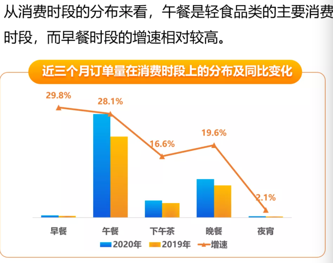 根据美团的数据,从消费时段的分布来看,轻食品类在午间是外卖配送高峰,但到了晚上,则呈现断崖式下坠,把它当做夜宵的人,更是少之又少。(当然,也不排除狠人们不吃晚饭。)