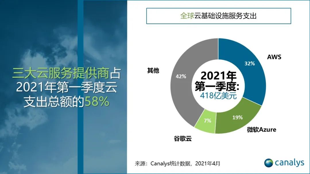 当然,该市场主要集中在少数玩家手中。尽管这条赛道上聚集了众多重量级玩家,但依据权威调研机构Canalys数据显示,亚马逊、微软与谷歌作为全球三大云巨头占据全球近六成云市场份额。2021年第一季度,全球云基础设施服务支出达到418亿美元,同比增长35%,比2020年第一季度高出超过100亿美元。