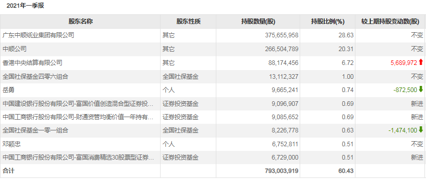 截至2021年4月30日,中顺洁柔控股股东广东中顺纸业集团有限公司(邓颖忠持股60%)持有公司股票375,655,958股,占公司总股本28.63%,中顺公司(邓颖忠持股100%)持有公司股票266,504,789股,占公司总股本20.31%,邓颖忠直接持有公司股票6,752,811股,占公司总股本0.51%。据此,邓颖忠累计直接或间接控制中顺洁柔股份比例约49.45%。