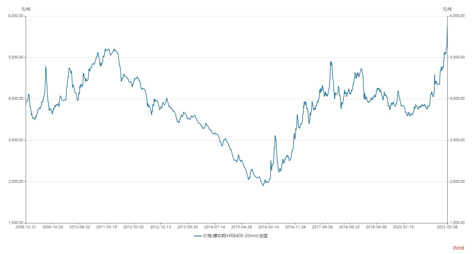 截至5月10日,螺纹钢价格已经创出历史新高的5885元/吨,相较2020年底的4368元/吨上涨34.7%,相较2020年低点的3578元/吨上涨64.4%。目前看,钢价疯涨并未有停止迹象。