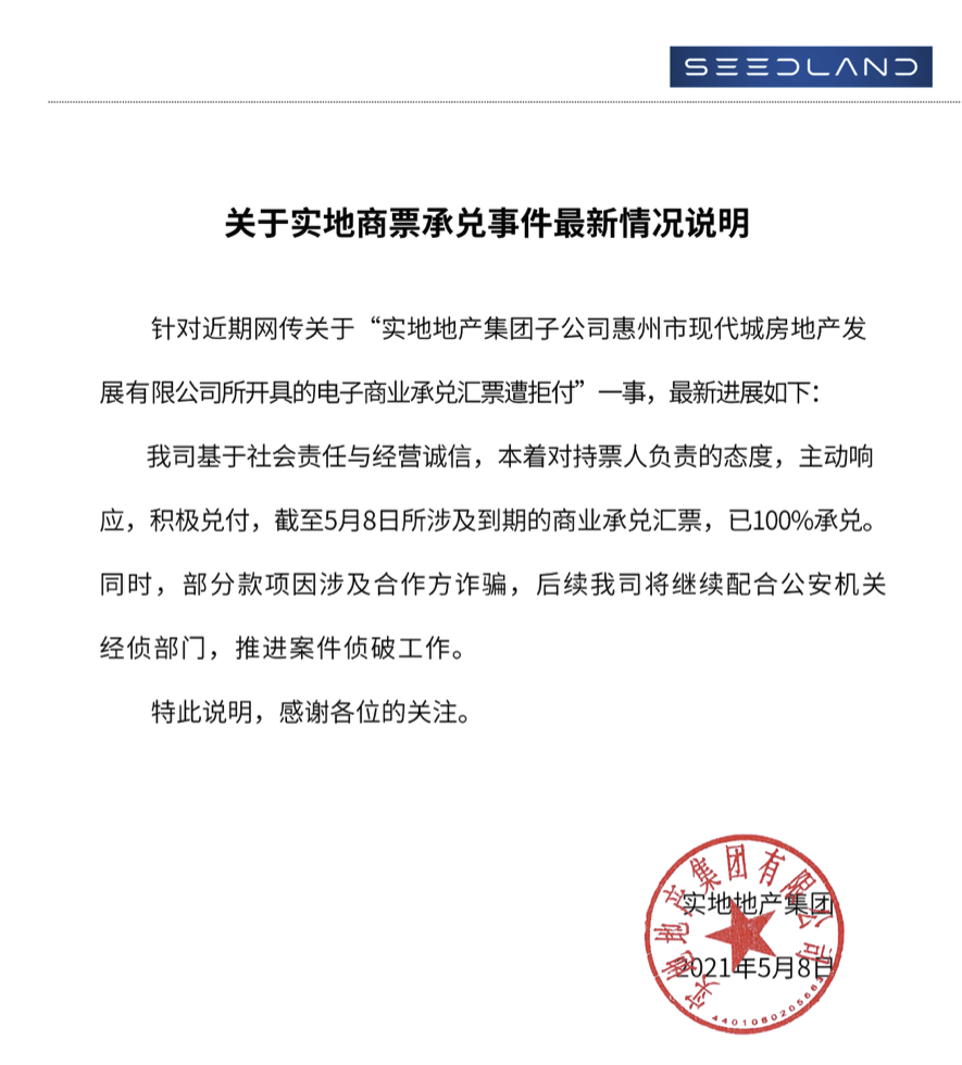5月10日消息,针对近期网传关于“实地地产集团子公司惠州市现代城房地产发展有限公司所开具的电子商业承兑汇票遭拒付”一事,实地地产集团于5月8日在其官网发布最新进展称:截至5月8日所涉及到期的商业承兑汇票,已100%承兑。同时,部分款项因涉及合作方诈骗,后续公司将继续配合公安机关经侦部门,推进案件侦破工作。