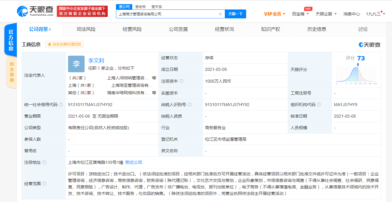 据天眼查APP显示,5月8日,上海人间唢呐管理咨询有限公司、上海琦才管理咨询有限公司接连成立,法定代表人同为李文利,注册资本均为1000万人民币,经营范围均包括广告发布;电子商务;化妆品的销售;货物进出口等。股东信息显示,两公司的最大股东均为李佳琦,持股比例99%,为最终受益人及疑似实际控制人。