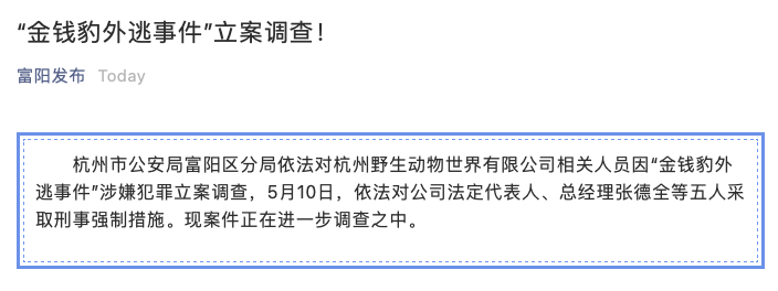 “富阳发布”微信公众号5月10日消息,杭州市公安局富阳区分局依法对杭州野生动物世界有限公司相关人员因“金钱豹外逃事件”涉嫌犯罪立案调查,5月10日,依法对公司法定代表人、总经理张德全等五人采取刑事强制措施。现案件正在进一步调查之中。
