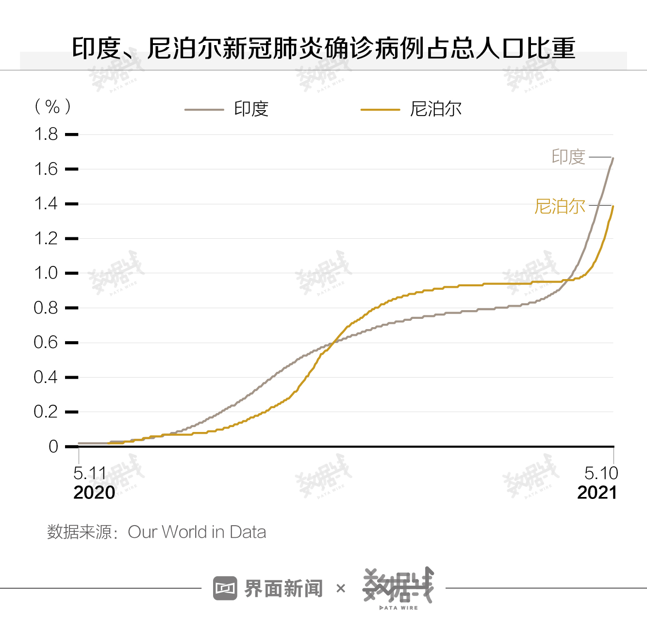 鉴于印度、尼泊尔两国人口总量差距巨大,从人口占比角度来看,截至5月10日,在总人口3000万左右的尼泊尔,新冠肺炎确诊病例占比约为1.39%,比13亿多人口的印度(1.67%)仅低了0.28个百分点。