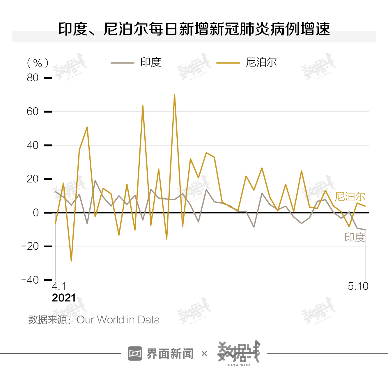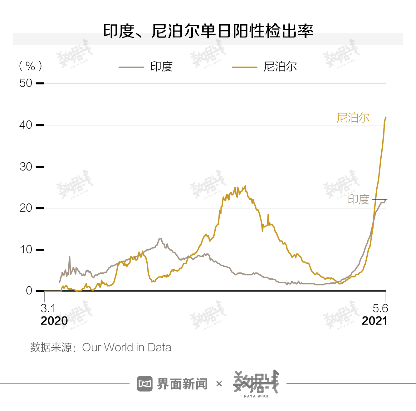 据Our World in Data数据,自4月21日以来,印度单日新增确诊病例已持续20天维持30万例水平,持续4天维持40万例水平,最高达41.24万例(5月6日)。同时段内,尼泊尔单日新增由2220例至9127例,20天累计涨幅达311.13%。
